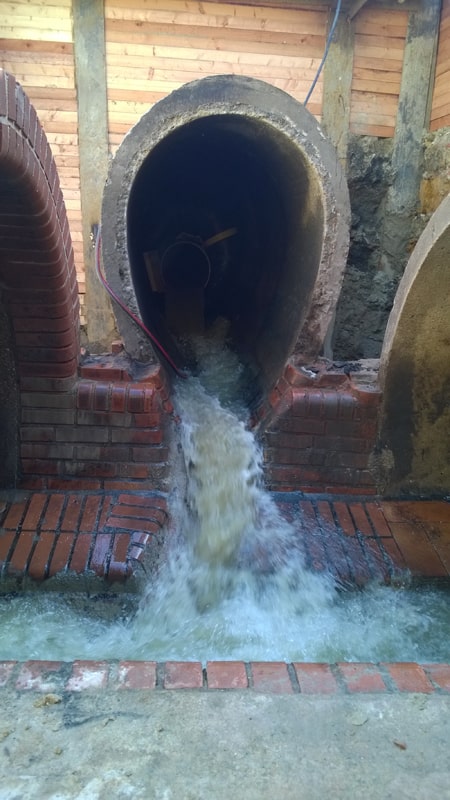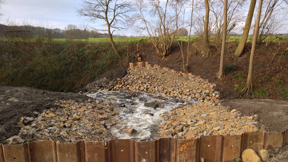 - Sanierung des Auslaufs des Kläranlagen-Ableiters; Rückbau des Rahmenprofils, Sicherung der Böschungen mit Spundwandprofilen sowie Andeckung der Böschungen mit Sandsteinen, Herstellung des Bachbettes